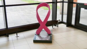Un ruban rose de 80 kg fabriqué par Hachette & Driout exposé dans le hall du Centre Hospitalier de Saint-Dizier