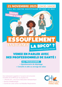 À l’occasion de la Journée mondiale de la BPCO (Broncho Pneumopathie Chronique Obstructive), le Cente Hospitalier de Bar-le-Duc Fains-Véel organise, un après-midi de sensibilisation pour mieux comprendre cette maladie respiratoire.