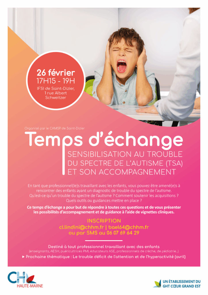 🧒🏻 L’équipe du CAMSP de Saint-Dizier organise jeudi 26 février 2026 un temps d’échange entre professionnels dédié au Trouble du Spectre de l’Autisme (TSA)