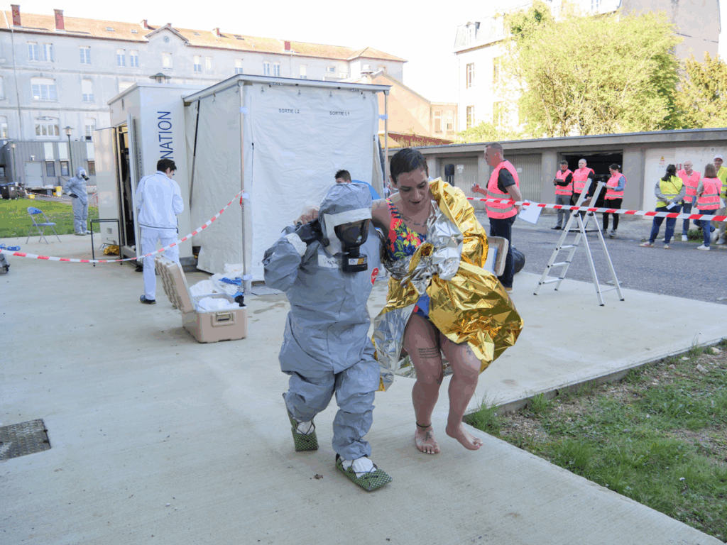 L’objectif de cet exercice était multiple : tester l’organisation de l’hôpital en situation NRC, entraîner les équipes à la prise en charge de victimes contaminées et mettre en œuvre, pour la première fois dans sa globalité, la chaîne de décontamination avec le Déconcube, un dispositif mobile permettant de décontaminer rapidement les victimes avant leur prise en charge hospitalière.