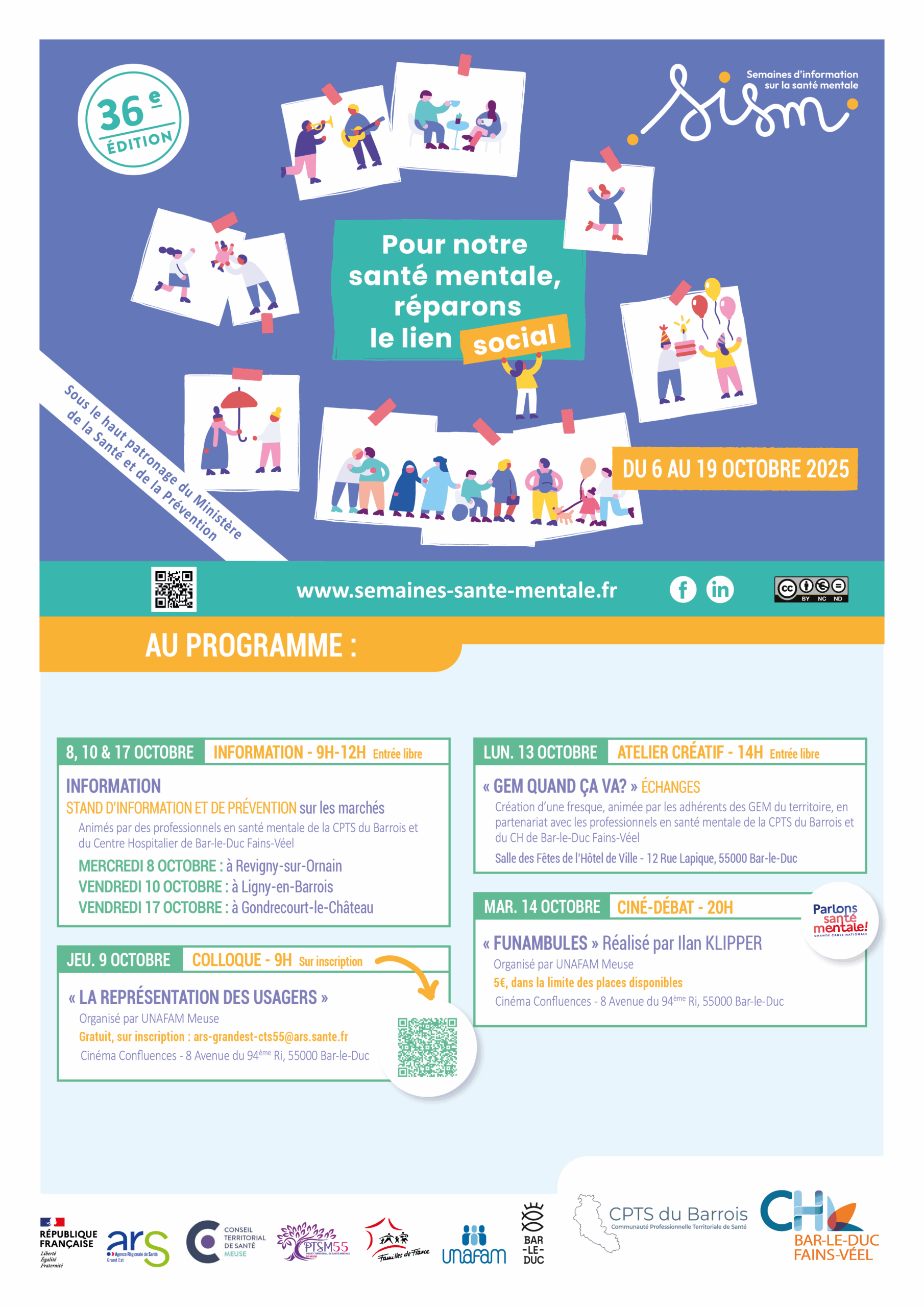Du 6 octobre au 7 novembre 2025, le Centres Hospitaliers de Verdun Saint-Mihiel et de Bar-le-Duc Fains-Véel participent aux Semaines d’Information sur la Santé Mentale (SISM) avec un programme d’événements variés. L’objectif est de sensibiliser le public et d’encourager le dialogue autour d’un sujet encore souvent tabou.