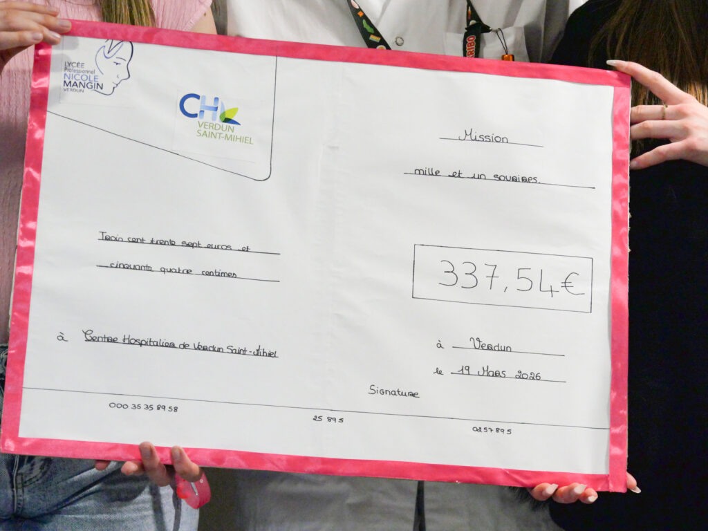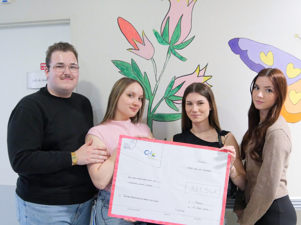 Le 19 mars, le service de pédiatrie du Centre Hospitalier de Verdun Saint-Mihiel a eu le plaisir d’accueillir Alyssia, Amélya, Belinda, Ethan et Lisa, élèves de Terminale Métiers du Commerce et de la Vente du lycée professionnel Nicole Mangin (site Alain Fournier de Verdun), venus remettre un chèque dans le cadre de leur projet de baccalauréat.
