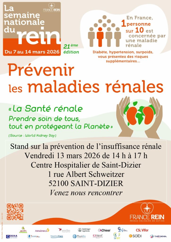 Dans le cadre de la semaine nationale du rein, l’association France Rein tiendra un stand sur la prévention de l’insuffisance rénale le vendredi 13 mars 2026 de 14H à 17H, dans le hall d’accueil du Centre Hospitalier de Saint-Dizier.